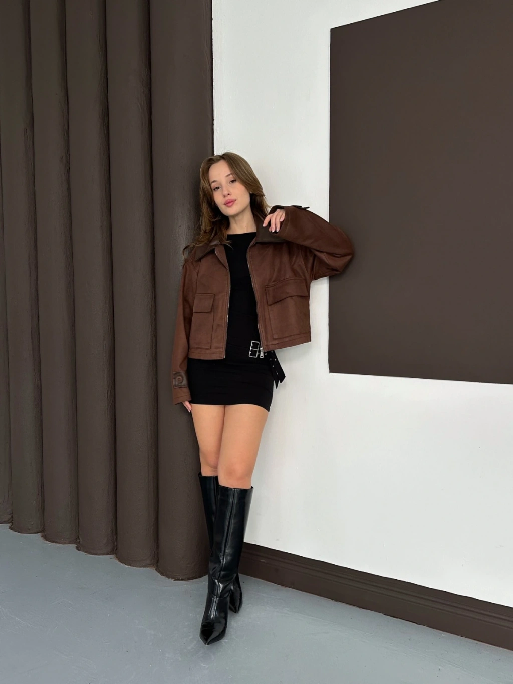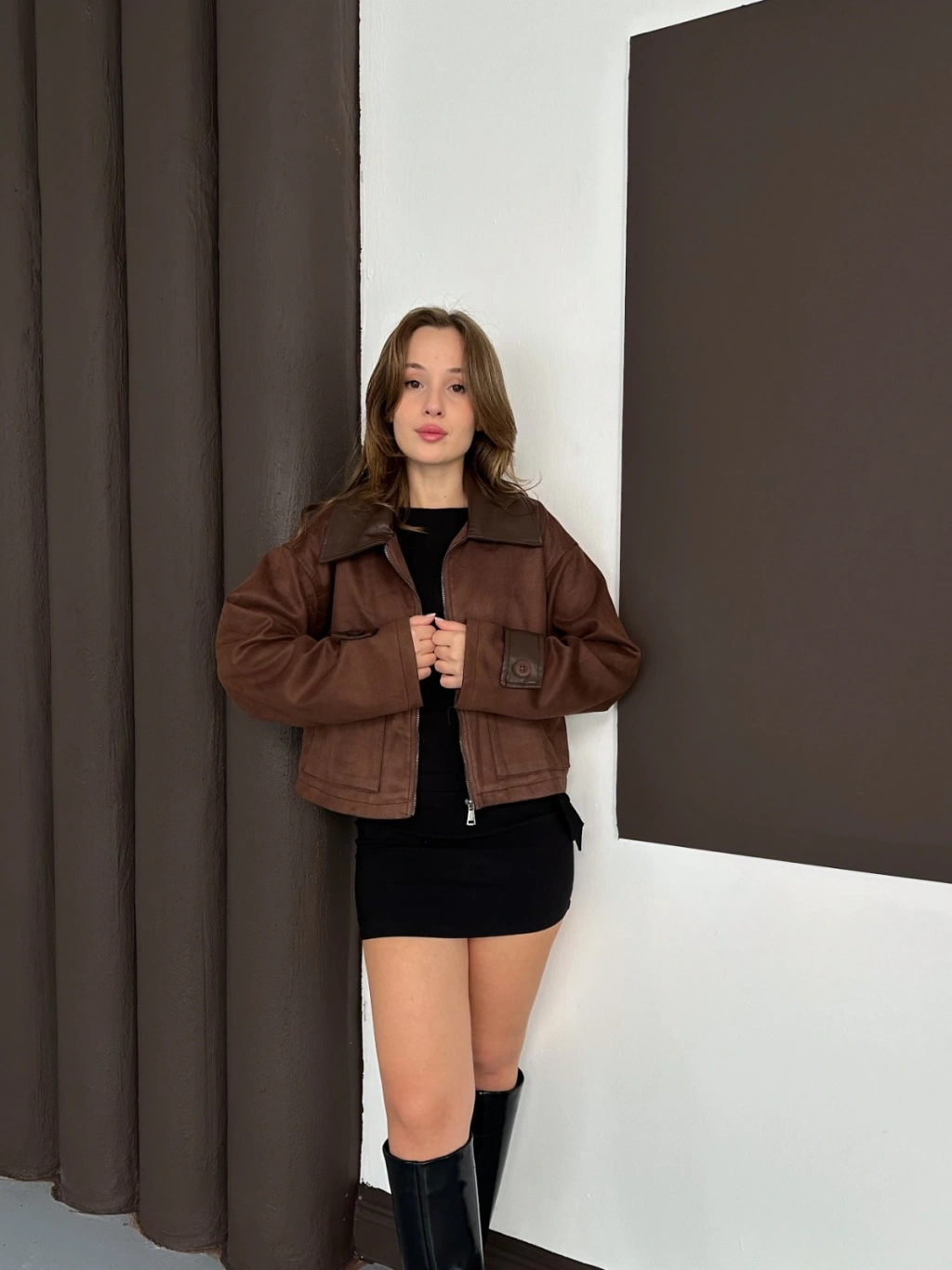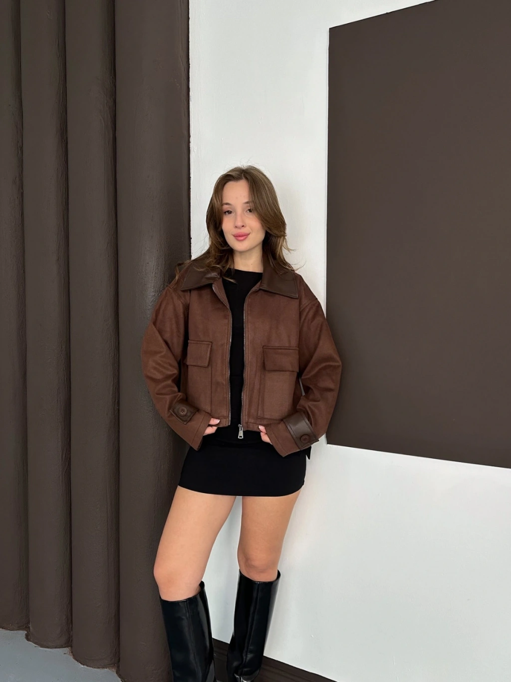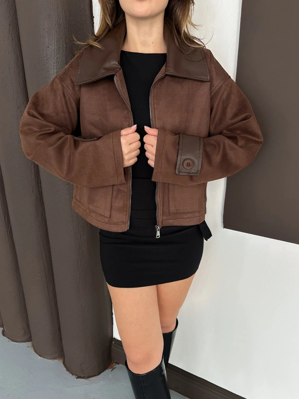 Yaka Kol Detaylı Cepli Nubuk Ceket Acı Kahve