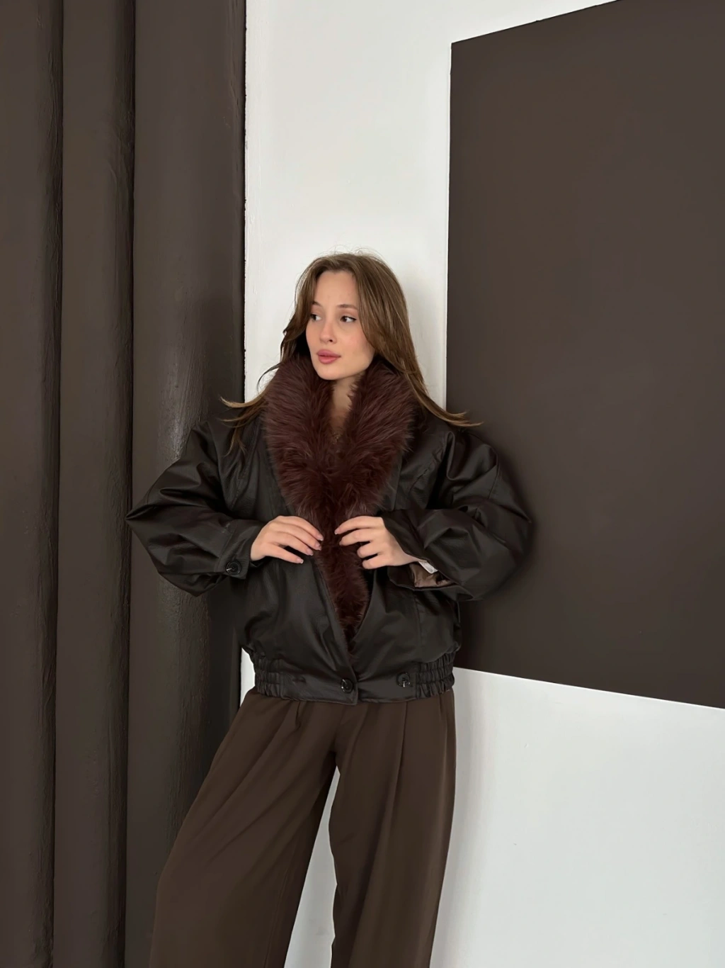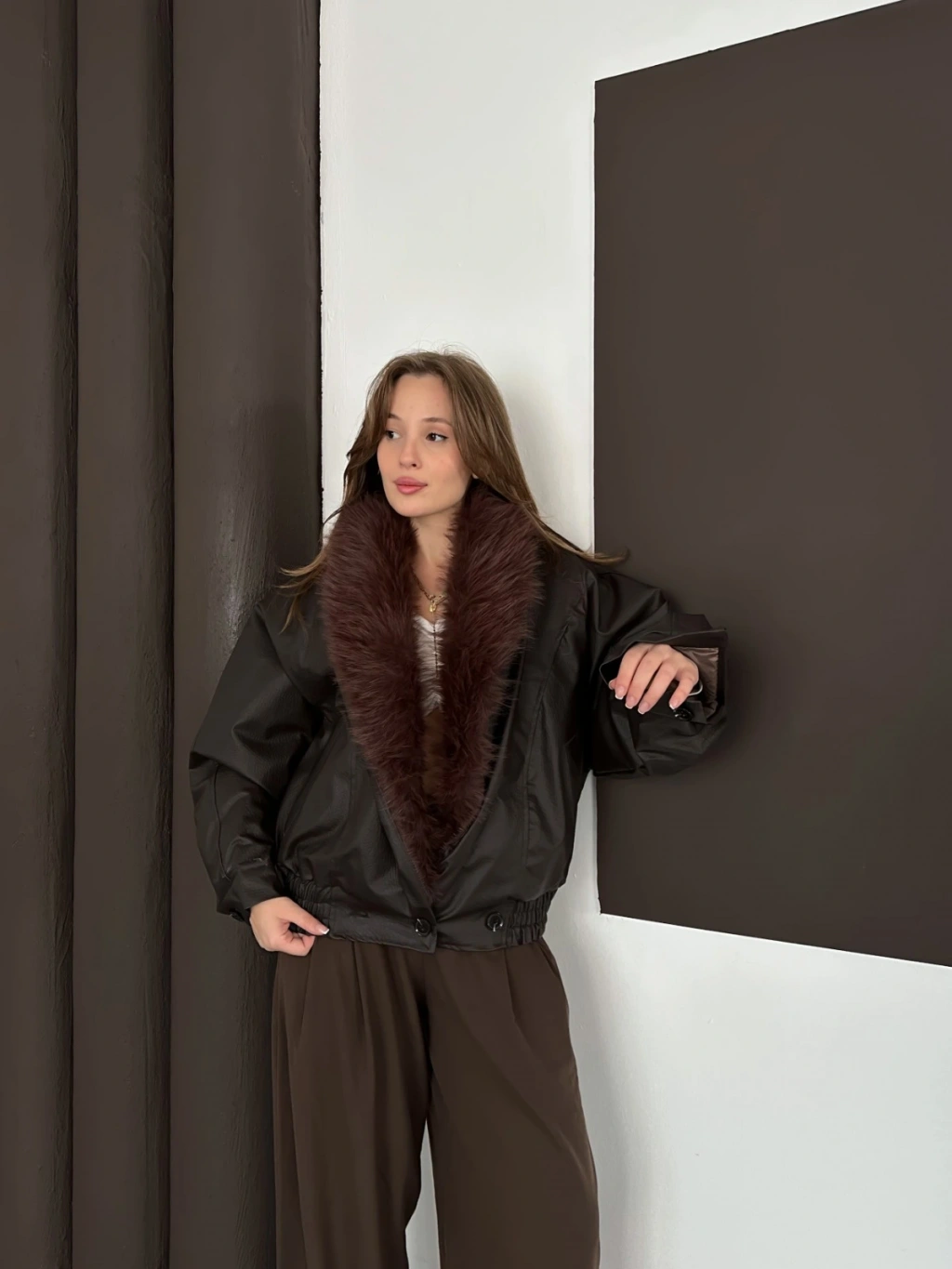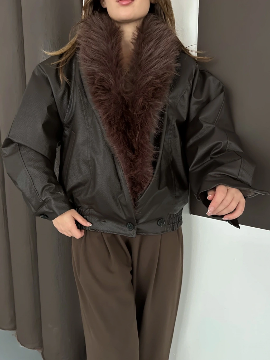 Yaka Peluş Detay Cepli Deri Ceket Acı Kahve