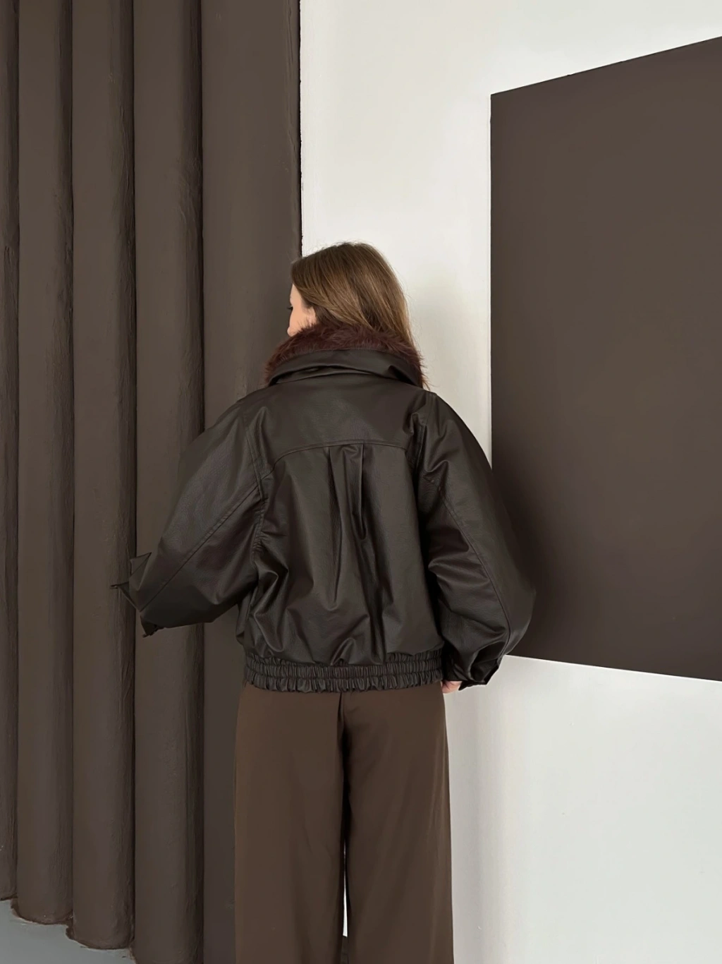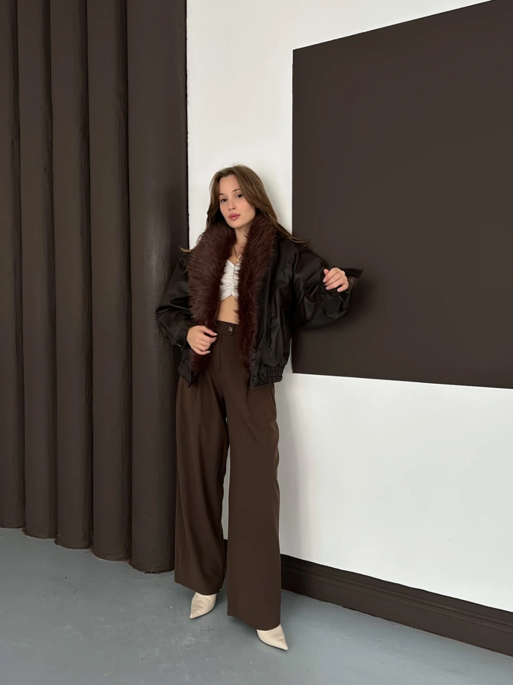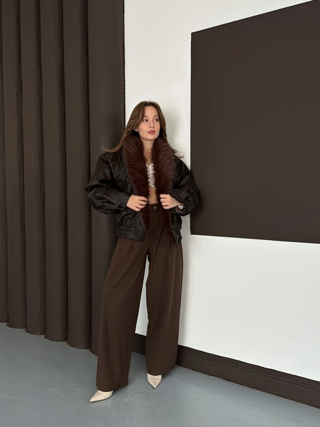 Yaka Peluş Detay Cepli Deri Ceket Acı Kahve