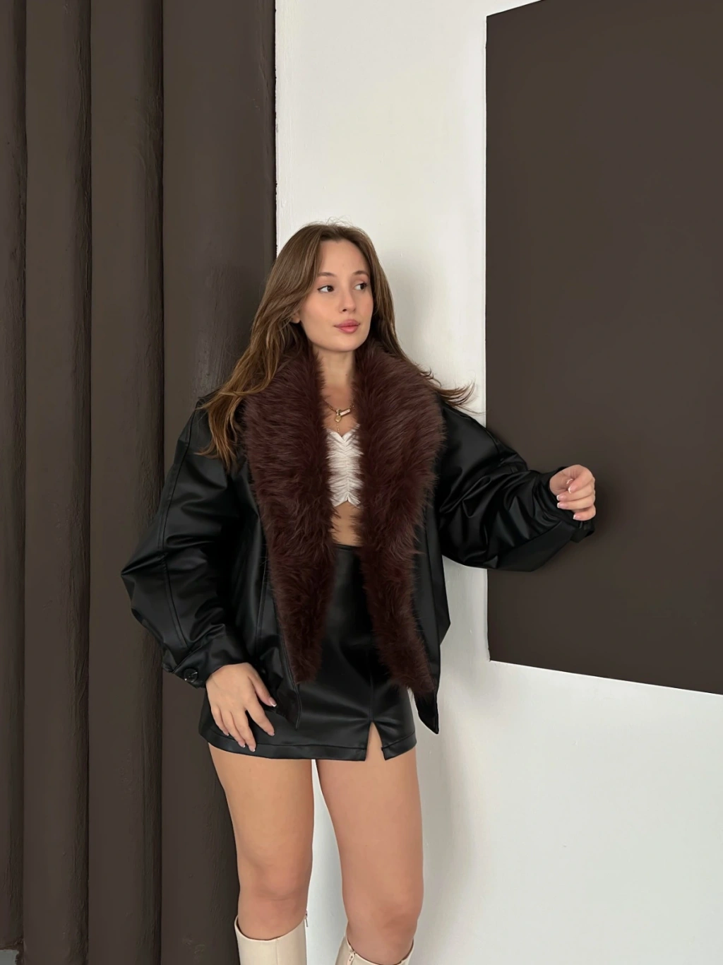 Yaka Peluş Detay Cepli Deri Ceket Siyah