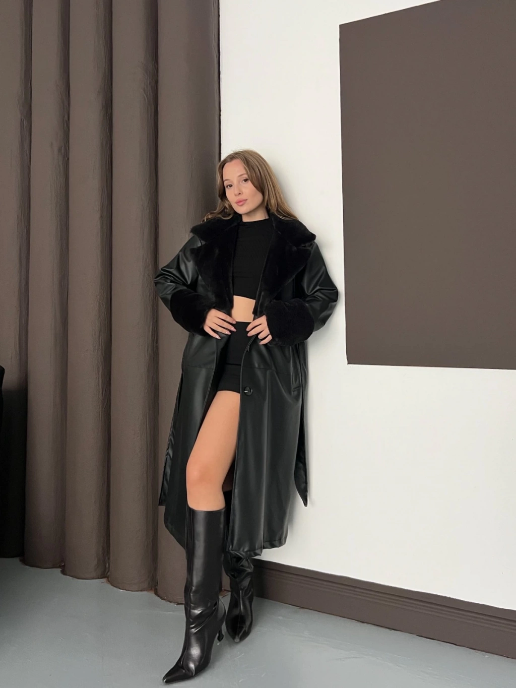 Yaka Peluş Detaylı Kuşaklı Deri Uzun Ceket Siyah