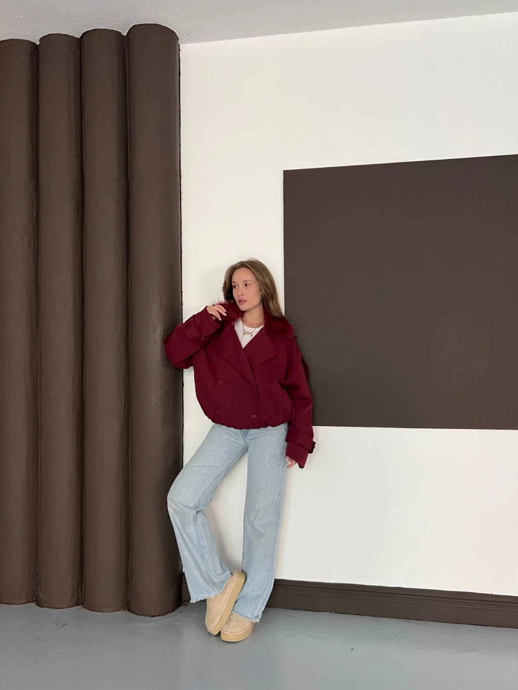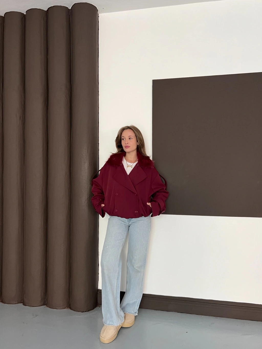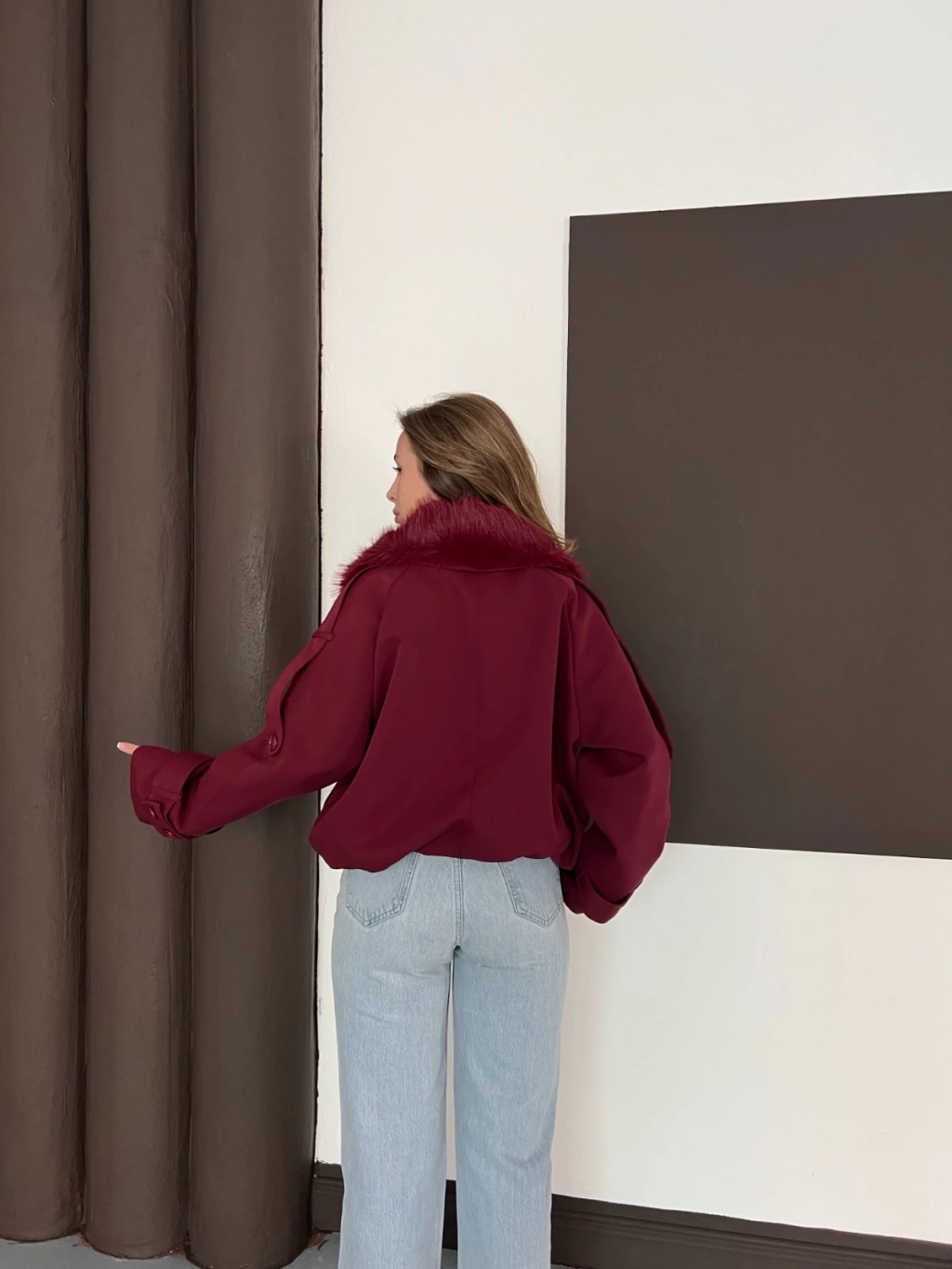 Yaka Peluşlu Bel Lastikli Tasarım Ceket Bordo