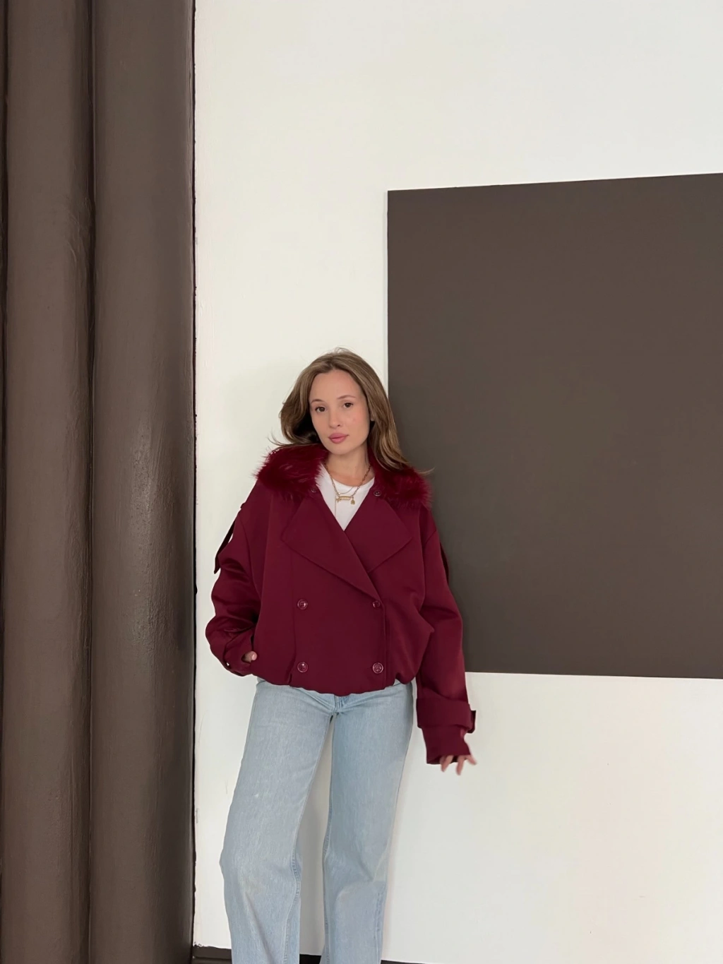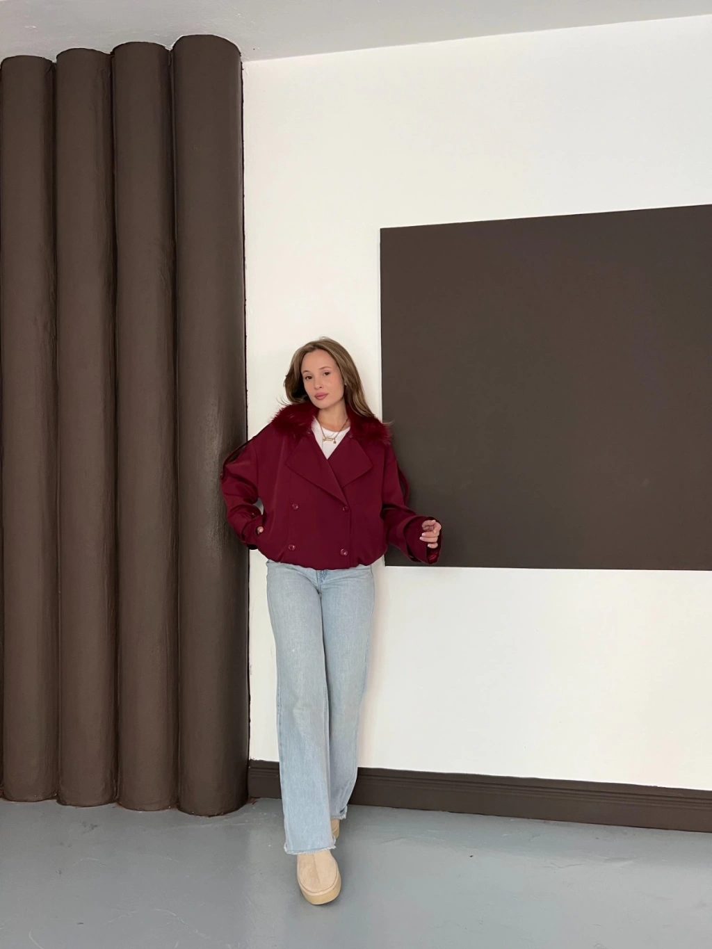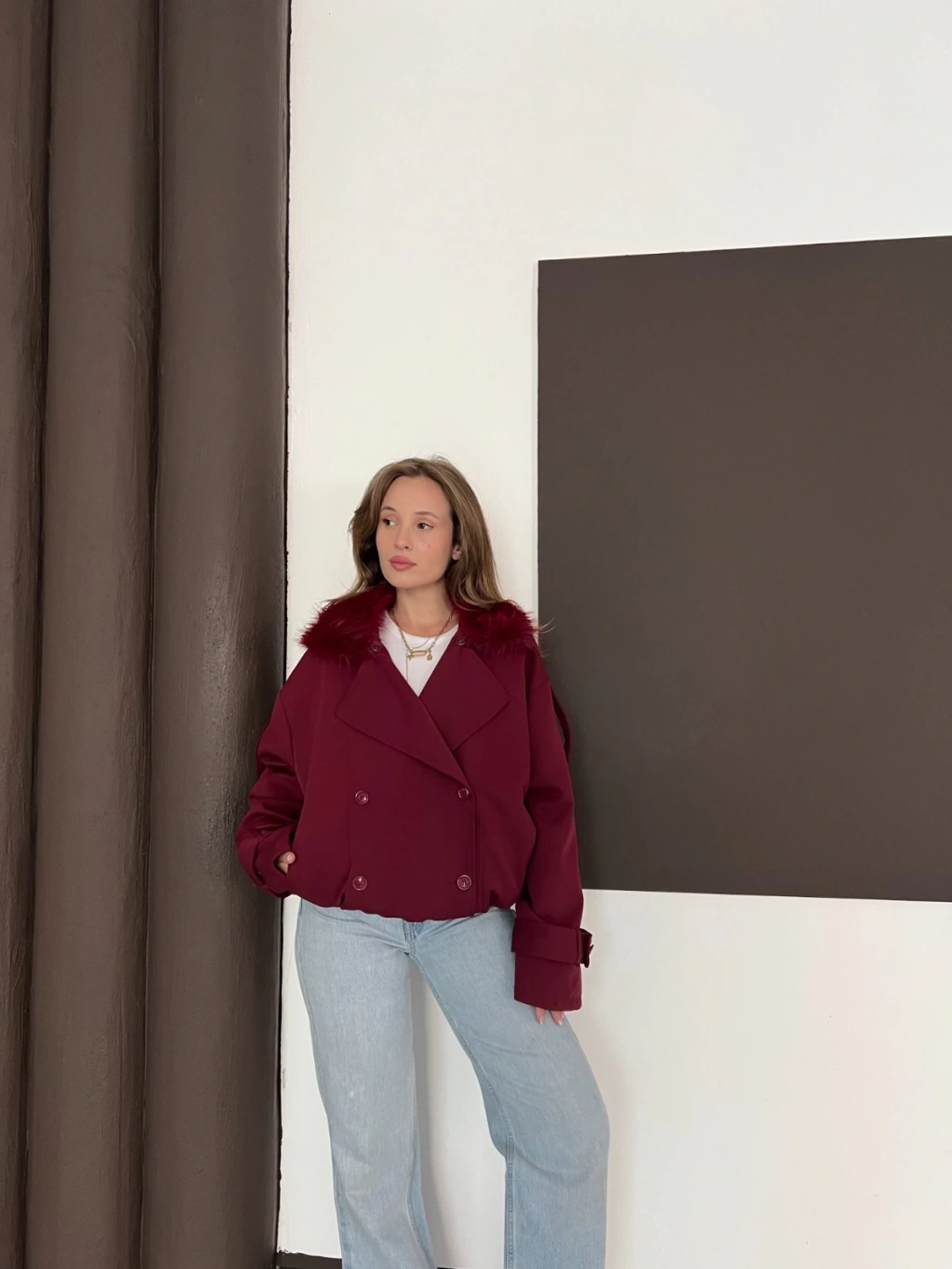 Yaka Peluşlu Bel Lastikli Tasarım Ceket Bordo