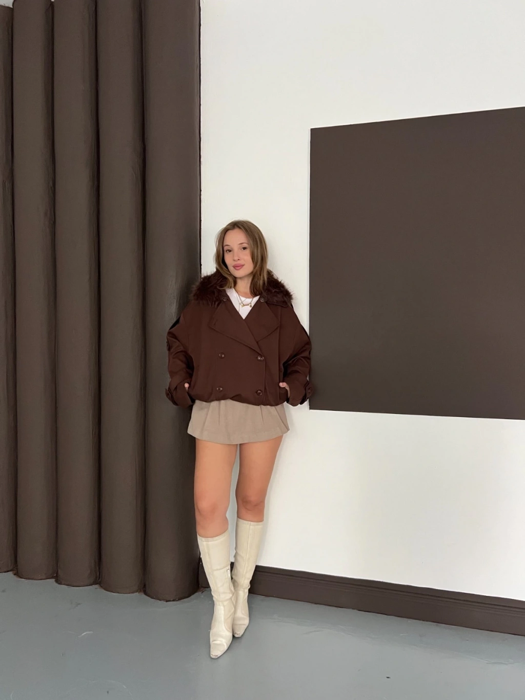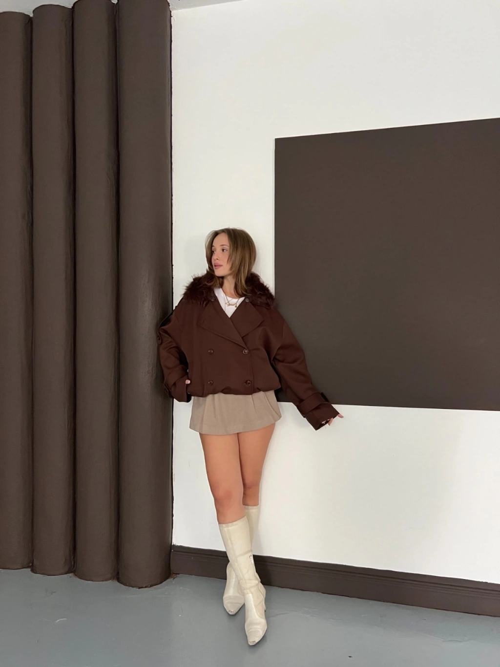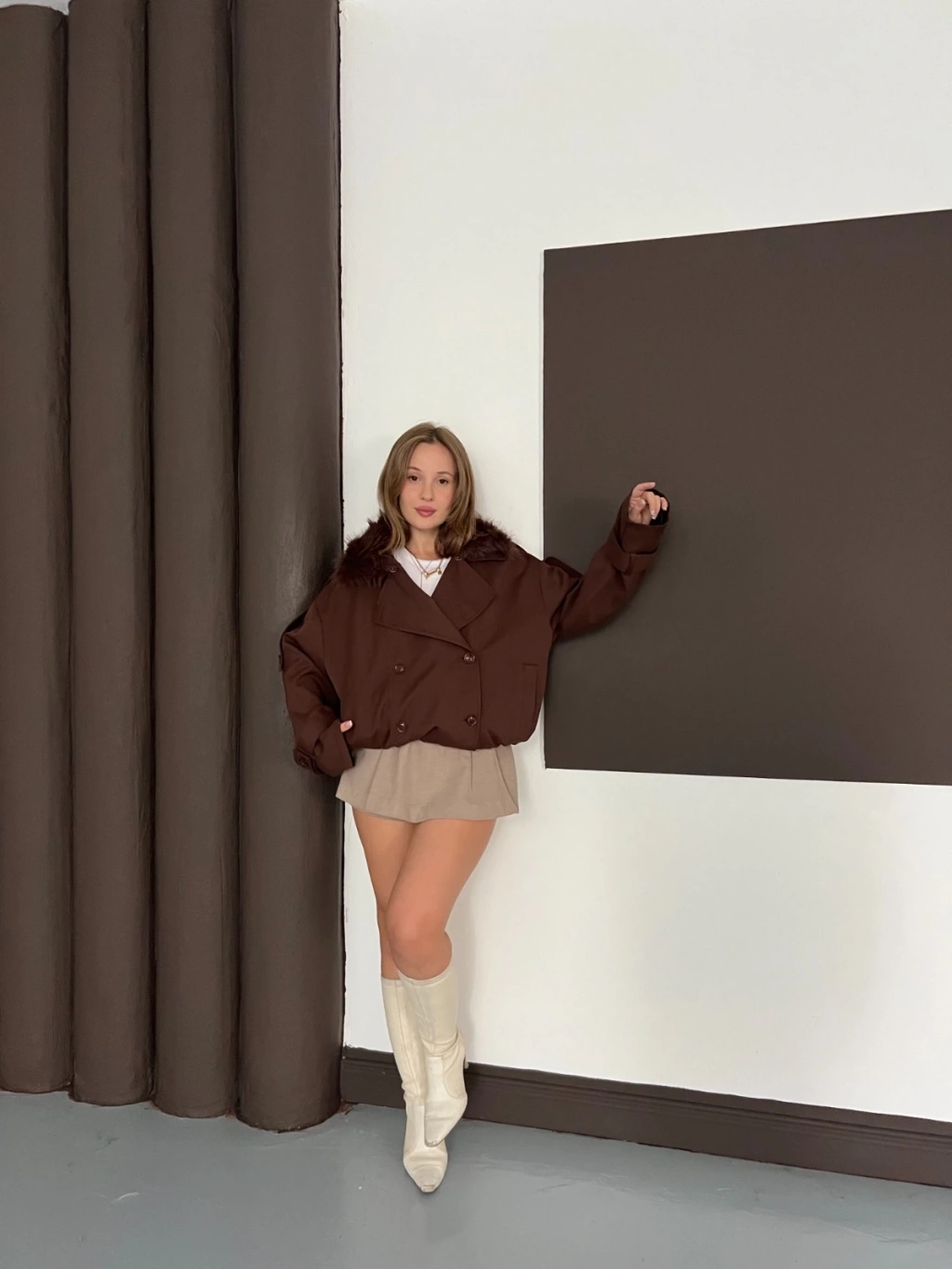 Kruvaze Yaka Cepli Kısa Kaşe Ceket Kahve