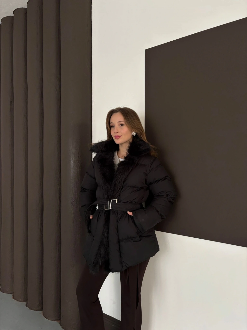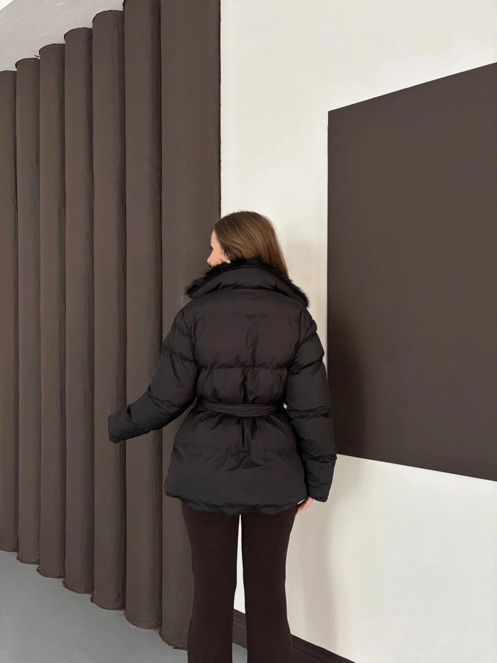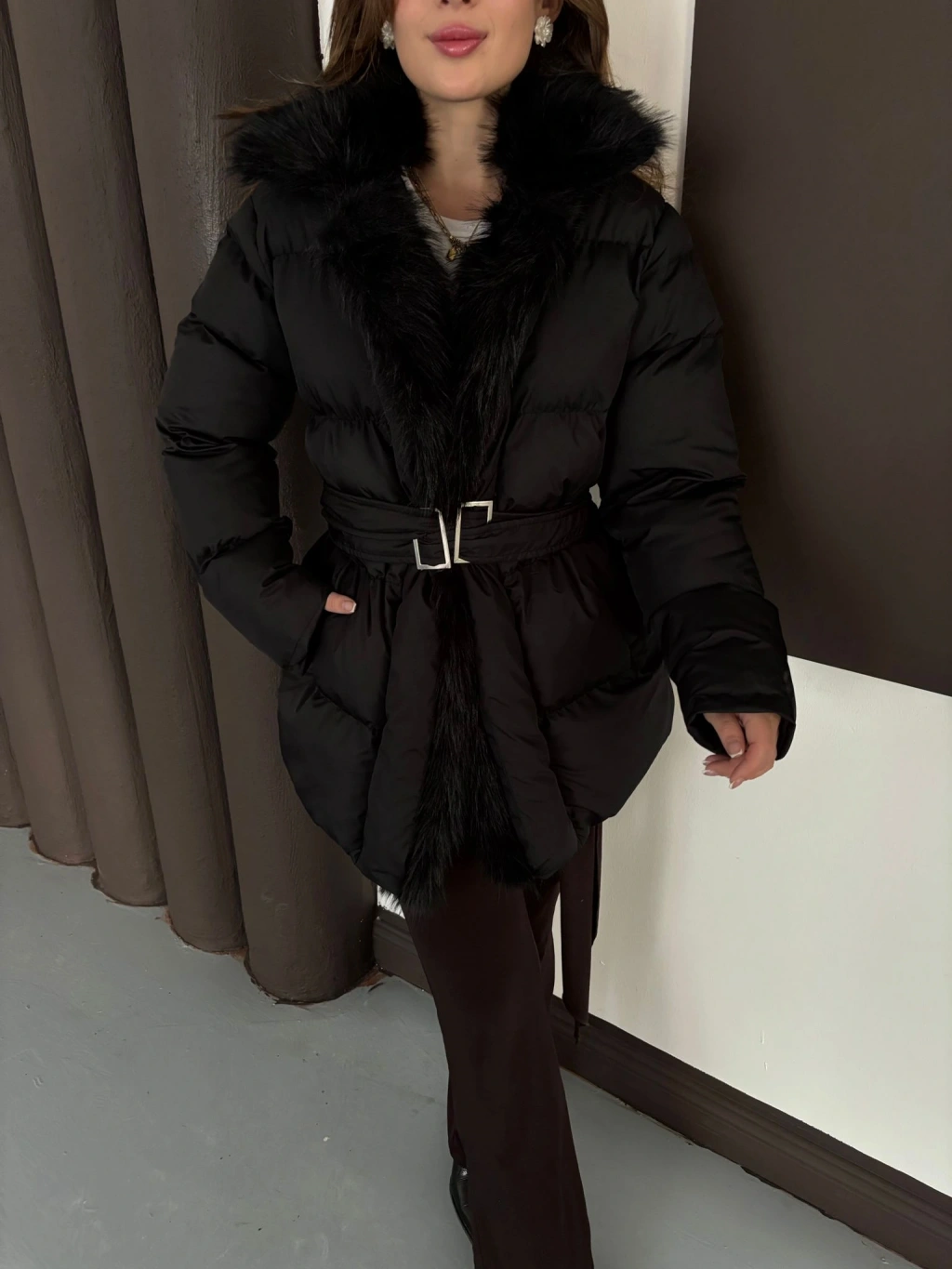 Yaka Peluşlu Kemer Detaylı Şişme Mont Siyah