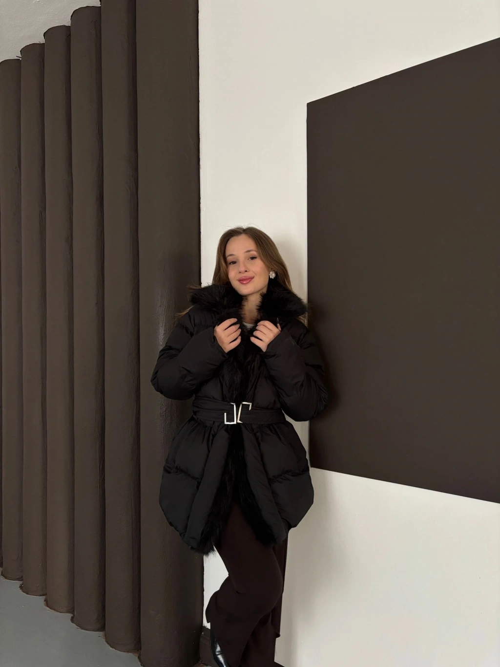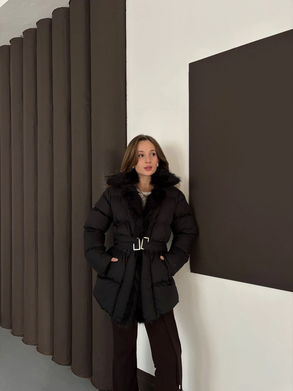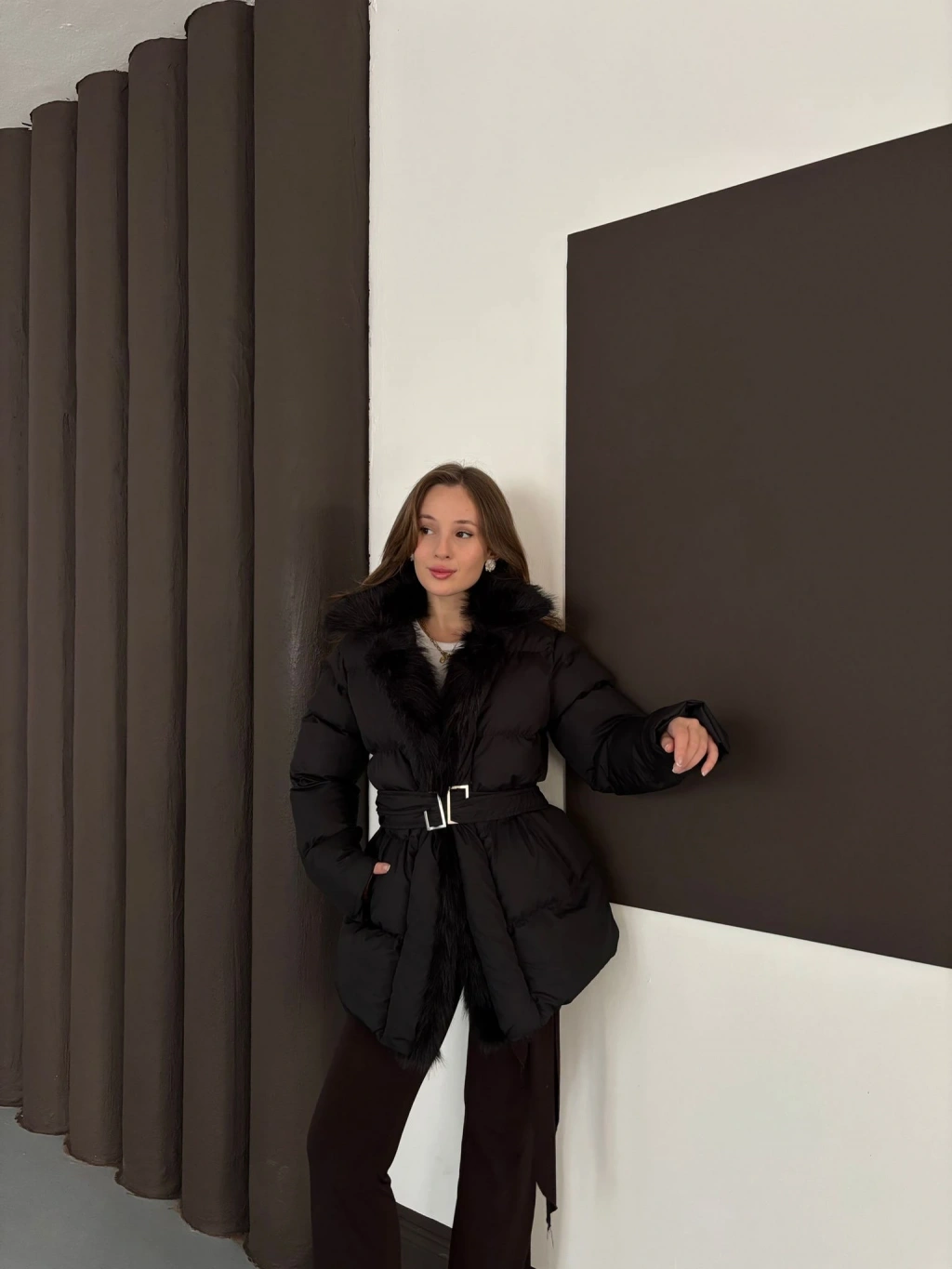 Yaka Peluşlu Kemer Detaylı Şişme Mont Siyah