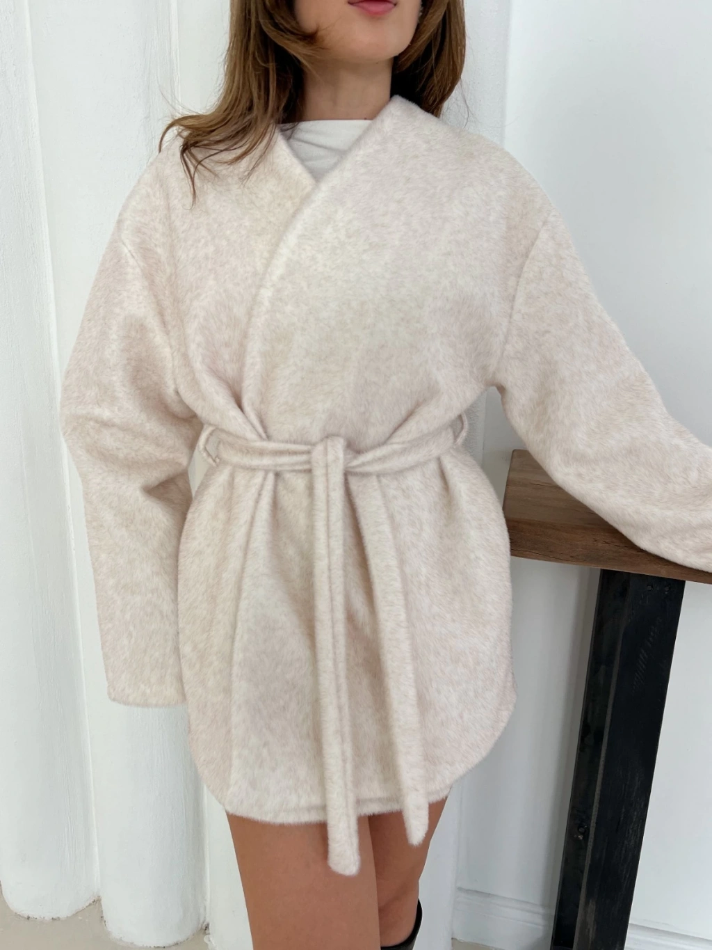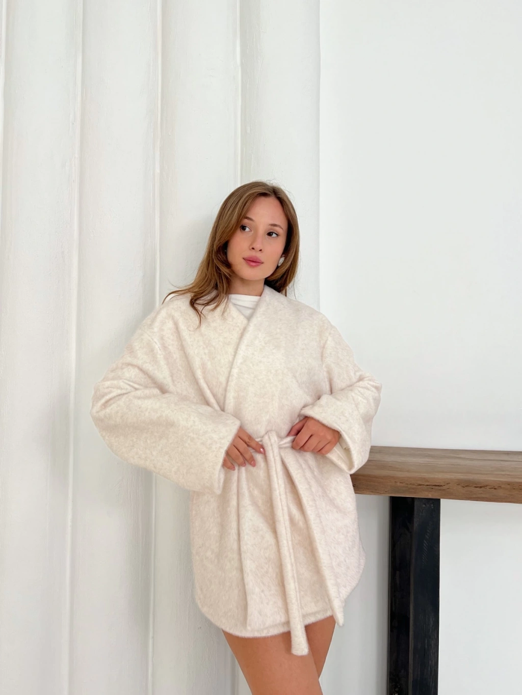 Yumuşak Dokulu Belden Kuşaklı Ceket Ekru